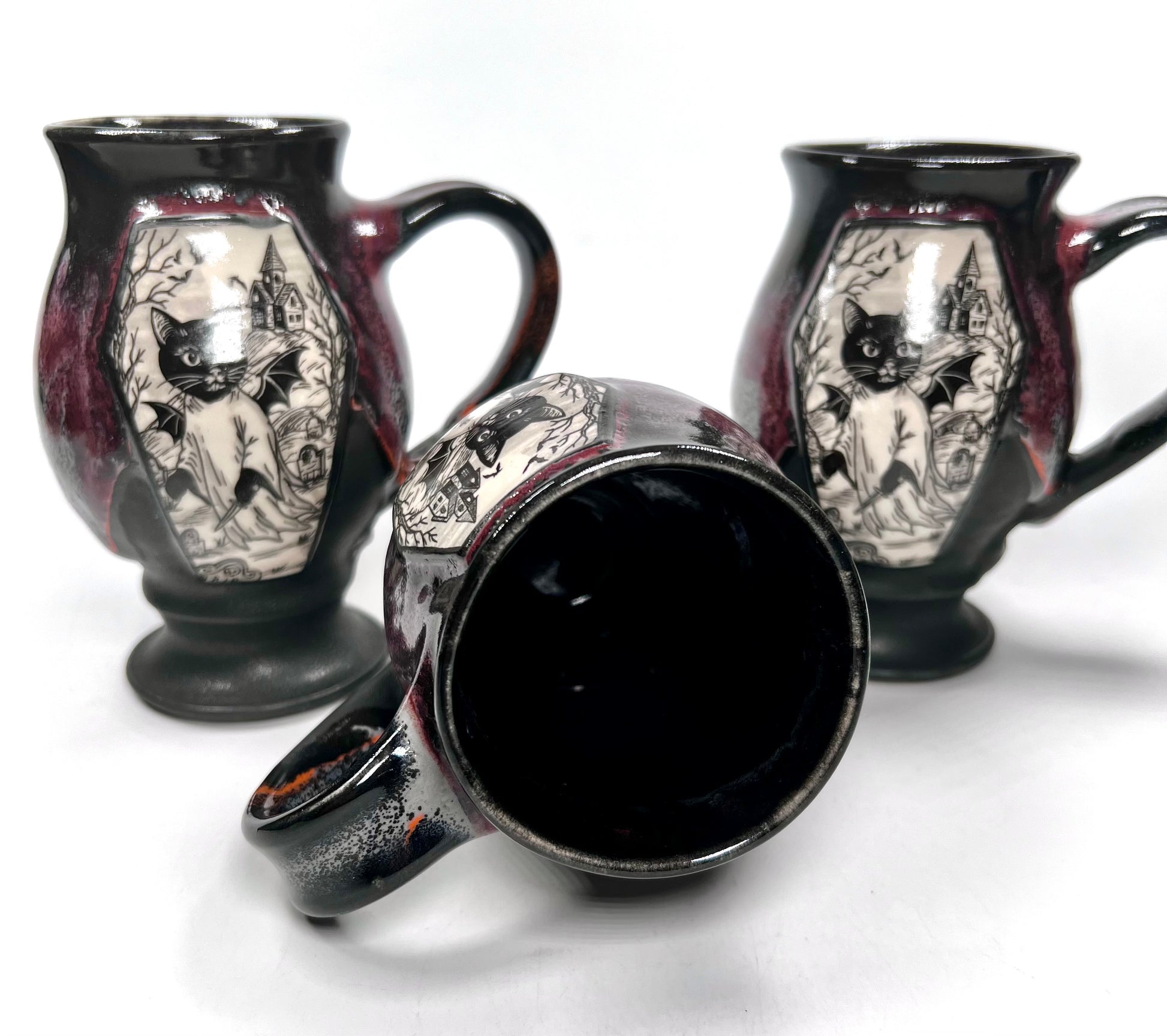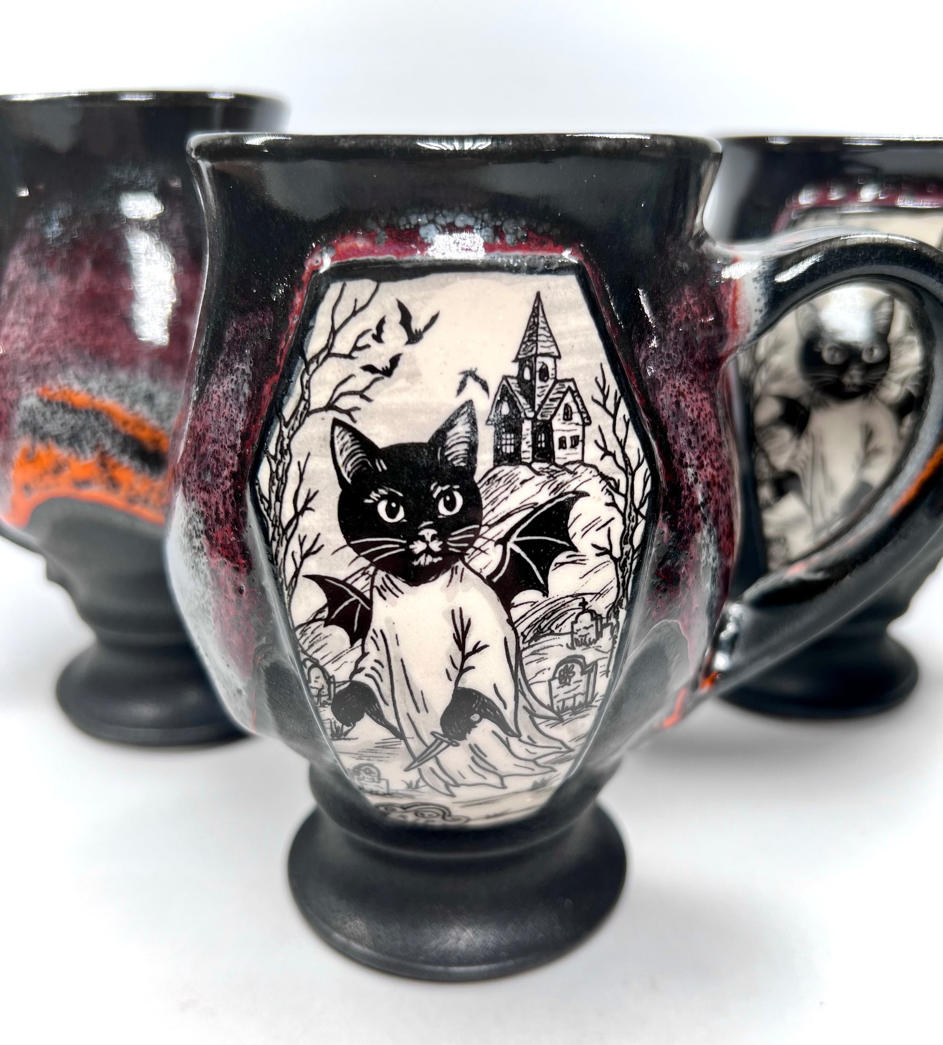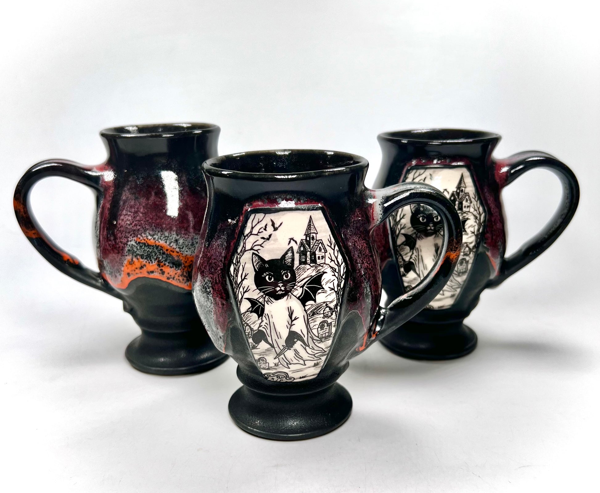Handmade Mug with one of my original drawings, on a coffin medallion. Glazed in a dark red, orange and grey drippy glaze