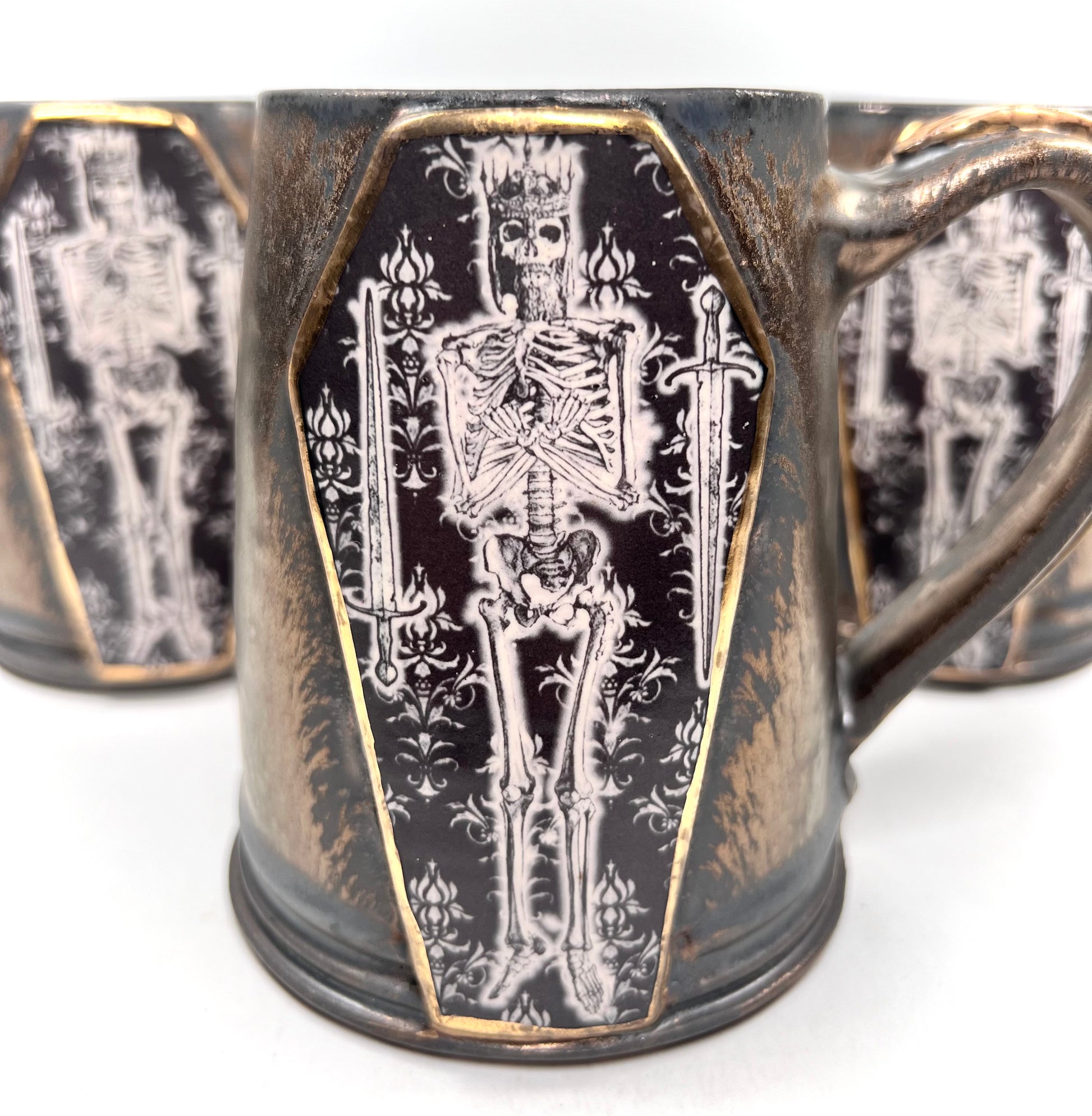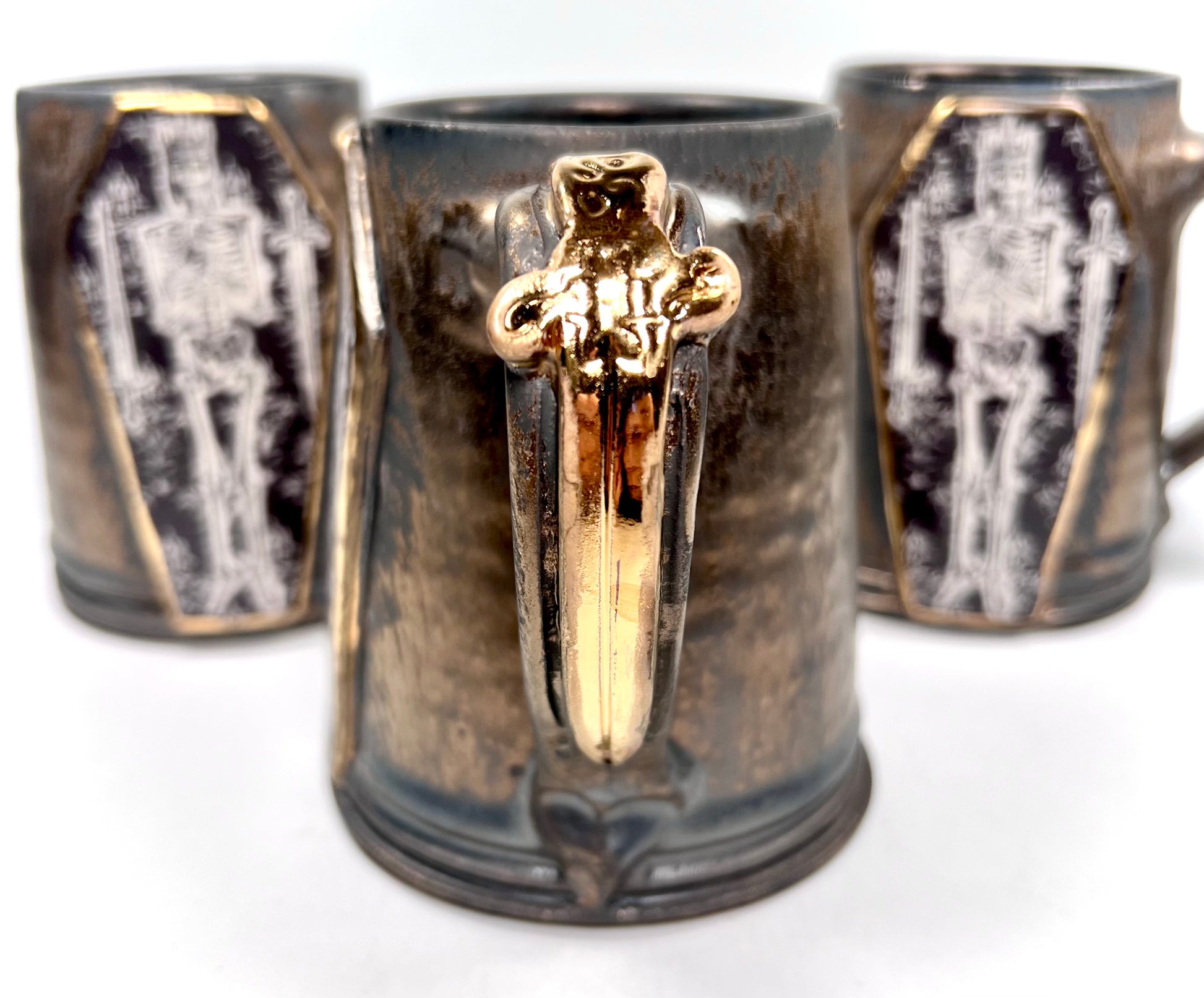 Stoneware mug glazed in antique gold, with 22k gold border and sword on the handle.