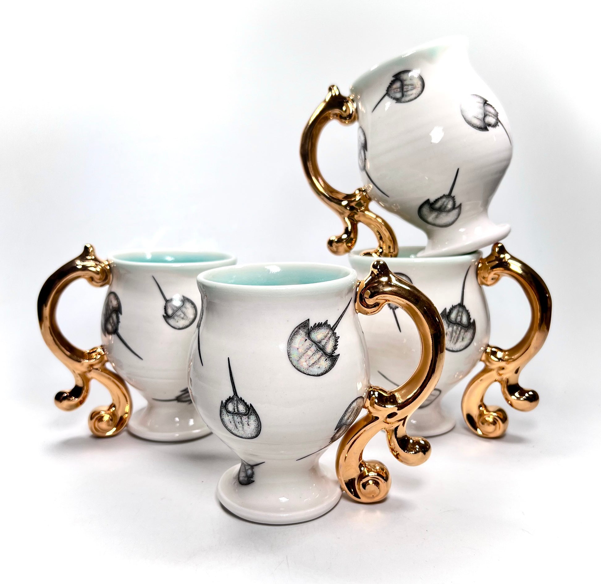 This mug has a bunch of Horseshoe crabs layered with mother of pearl, on a white porcelain clay. the baroque style handle has a layer of 22k gold.