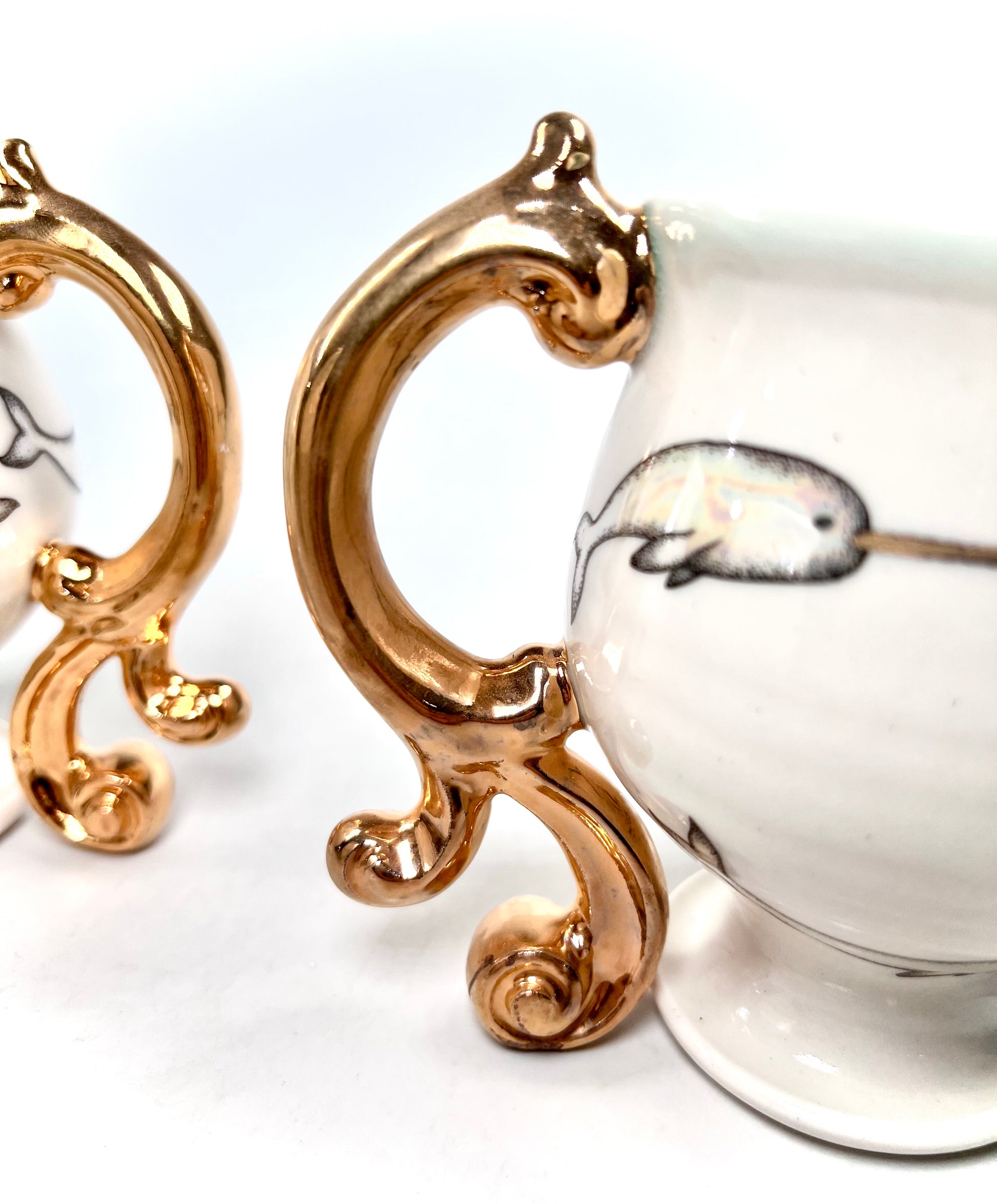 This mug has a bunch of mini narwhals layered with mother of pearl, on a white porcelain clay. the baroque style handle has a layer of 22k gold.